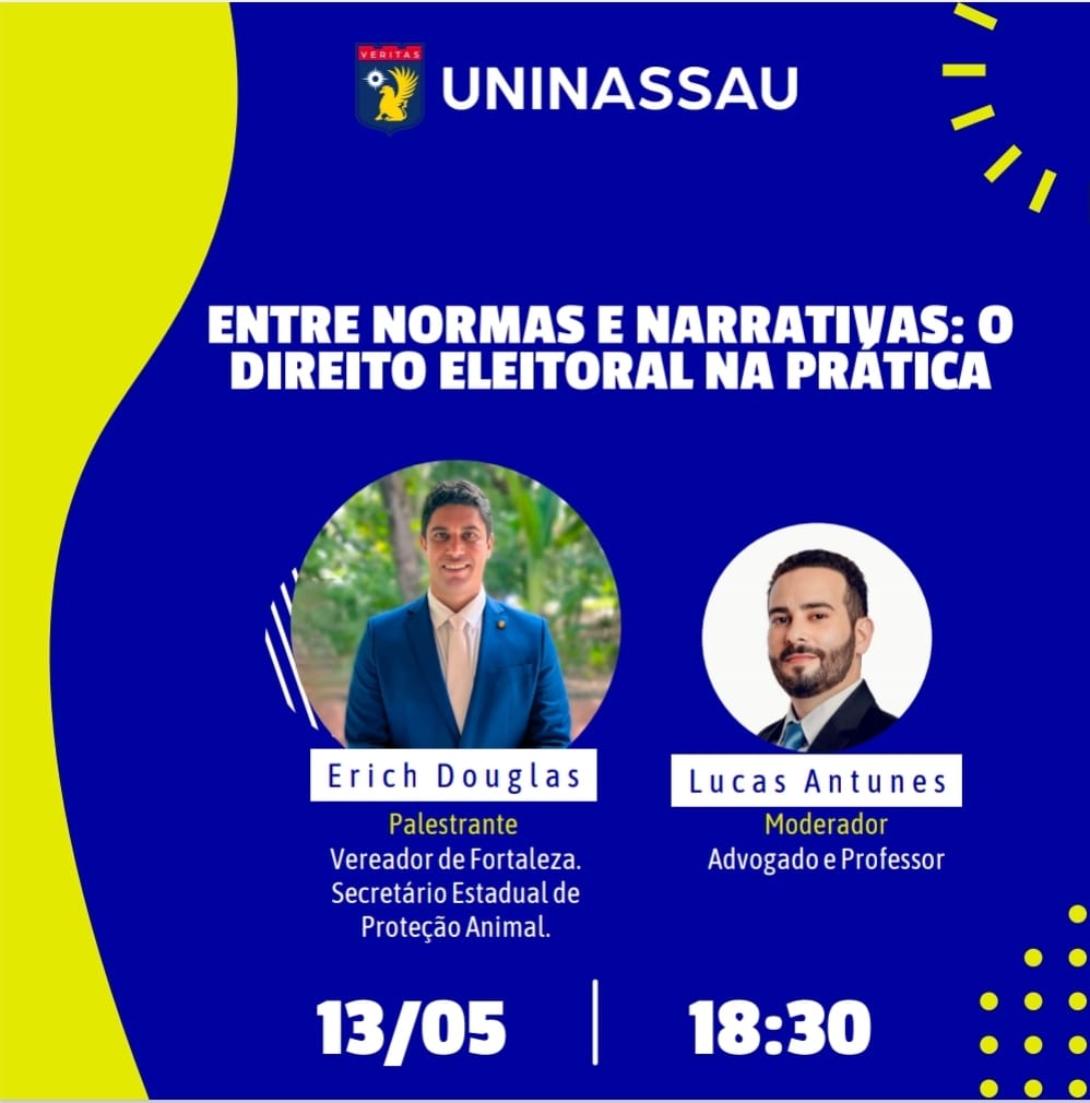 O vereador de Fortaleza e Secretário Estadual da Proteção Animal, Erich Douglas, será um dos participantes da palestra “Entre Normas e Narrativas: o direito eleitoral na prática”, que acontece nesta terça-feira (13), às 18h30, na Uninassau. O evento reúne nomes da política e do direito para discutir os bastidores e os desafios da legislação eleitoral no Brasil.